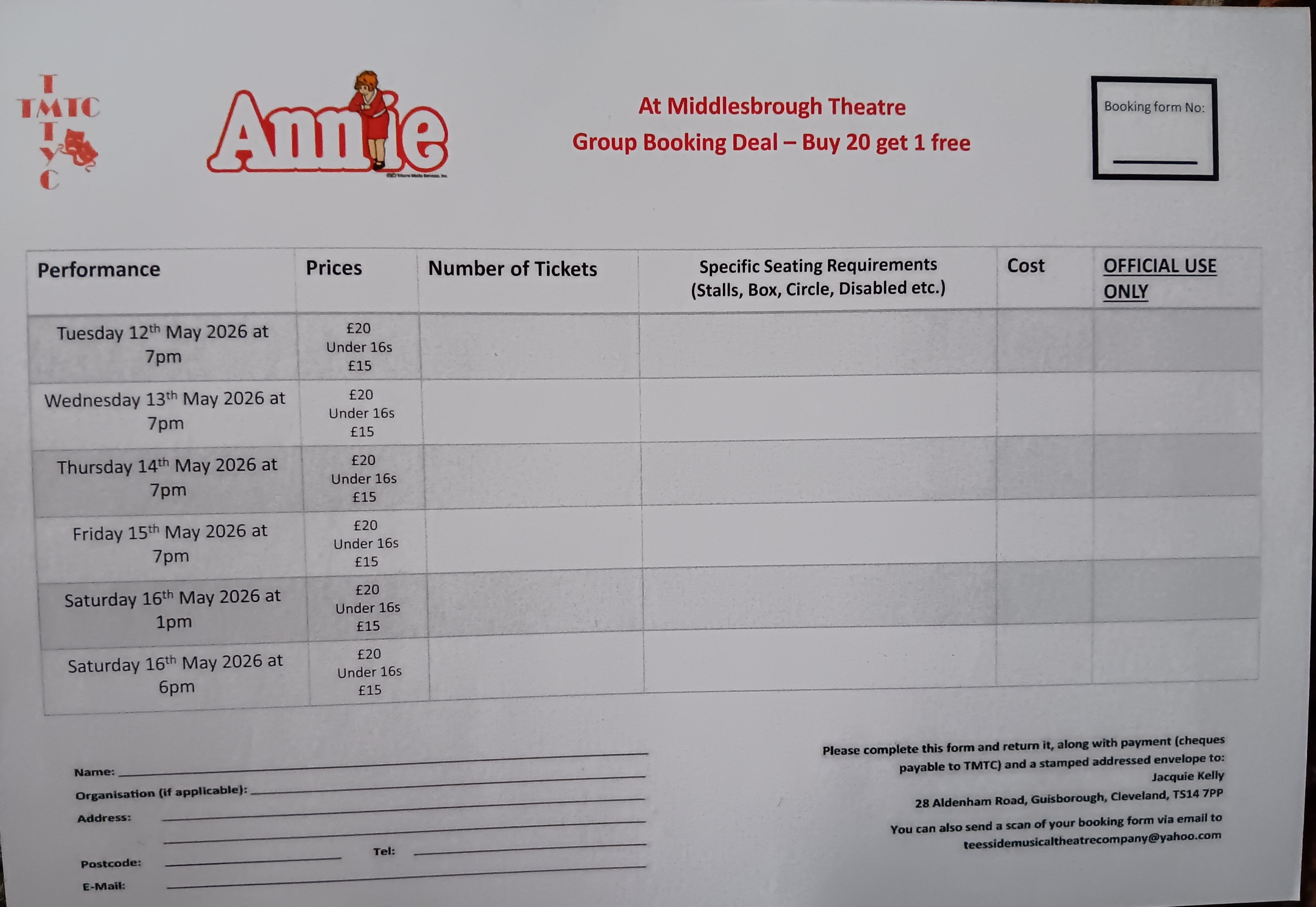 Tickets can be ordered by calling us on 07712 485211 or drop an email order to teessidemusicaltheatrecompany@yahoo.com. Alternatively, use link to booking form to download and print out to send to our Ticket Secretary. You can also order tickets from Middlesbrough Theatre on 01642 81 51 81 (subject to a booking fee).